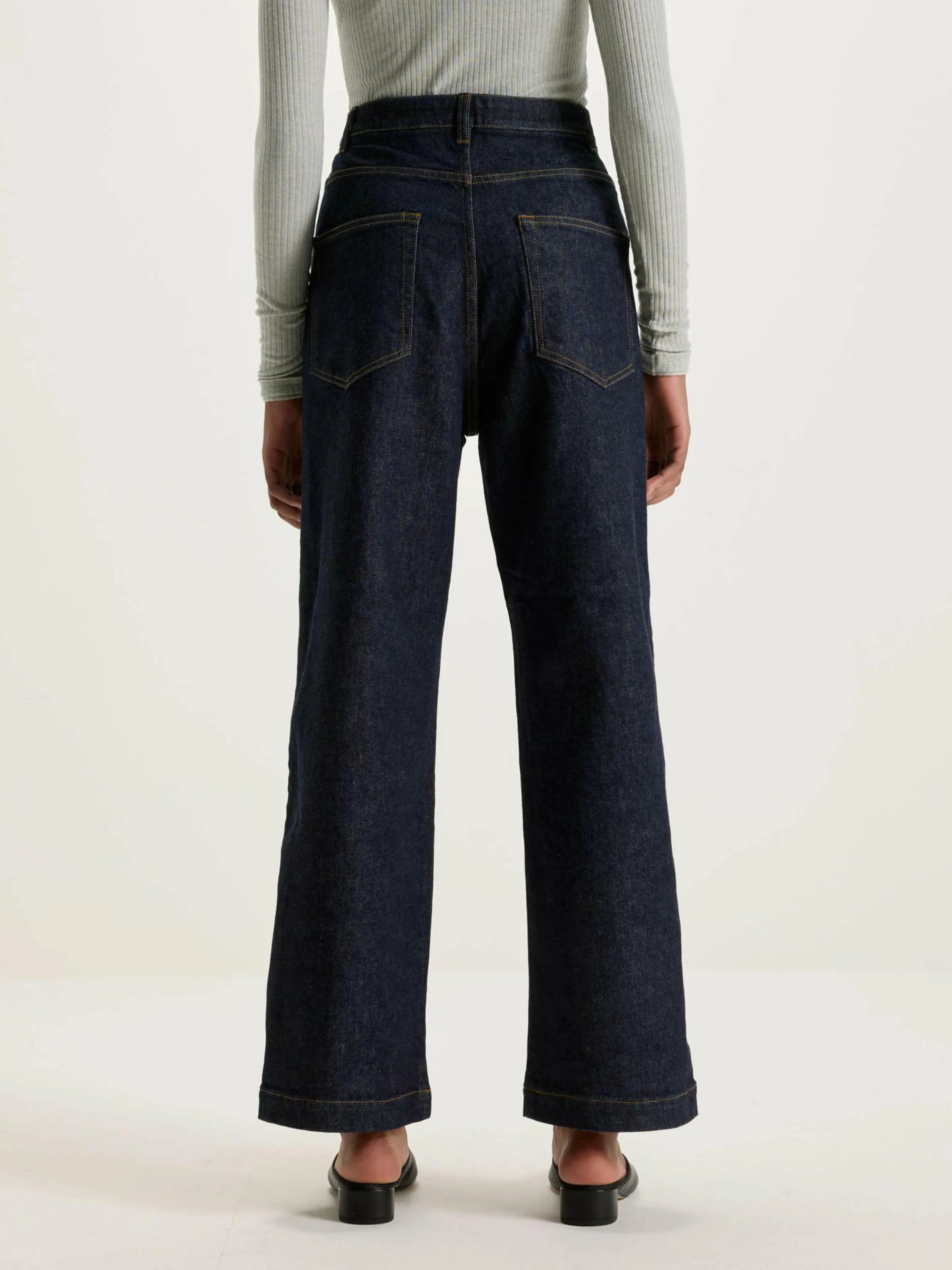 Le jean en denim japonais Sophia de la marque japonaise de luxe Nicholson & Nicholson présente une silhouette large et évasée.