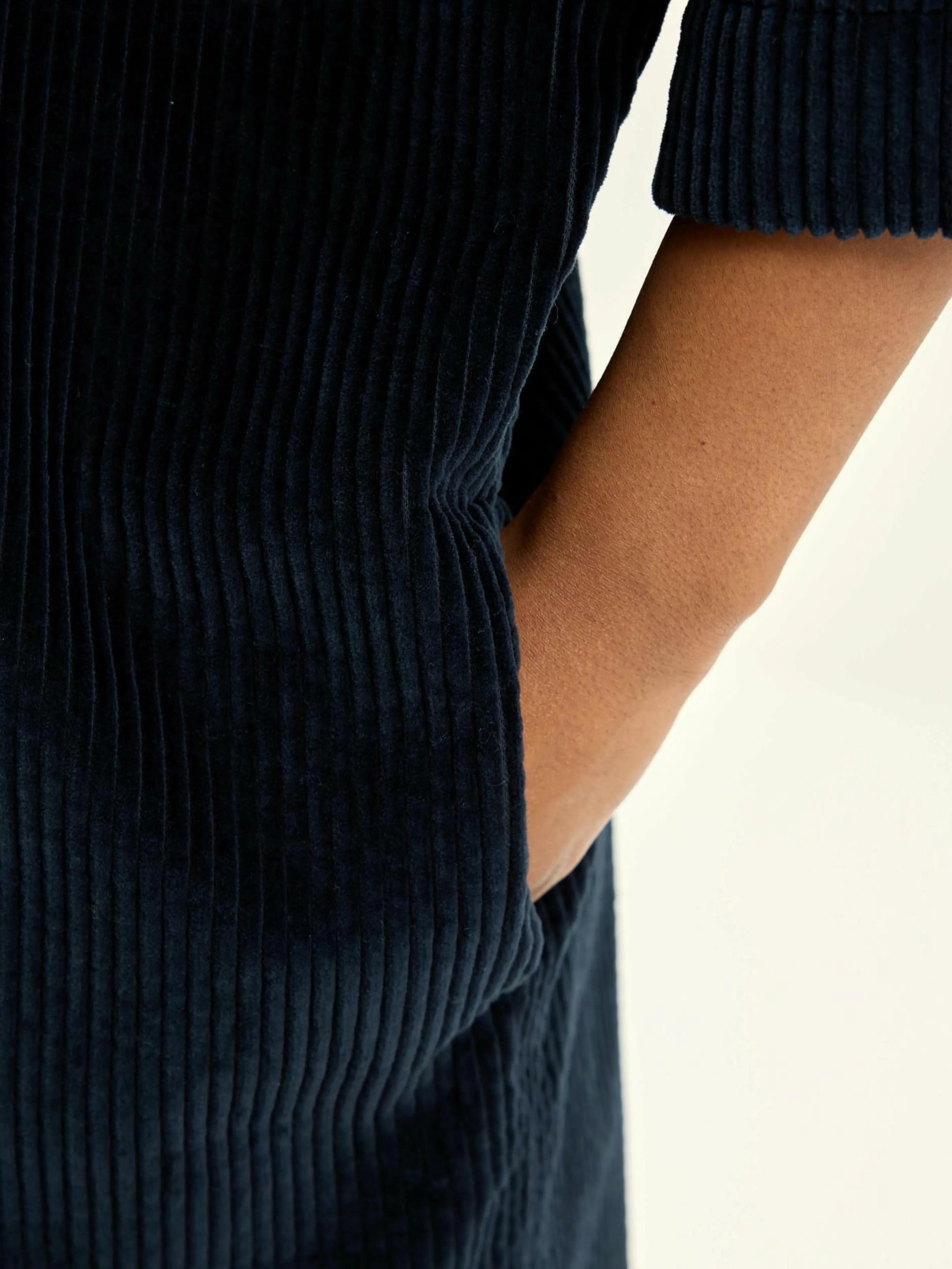 Robe-chemise oversize en velours de coton à côtes larges couleur bleu.