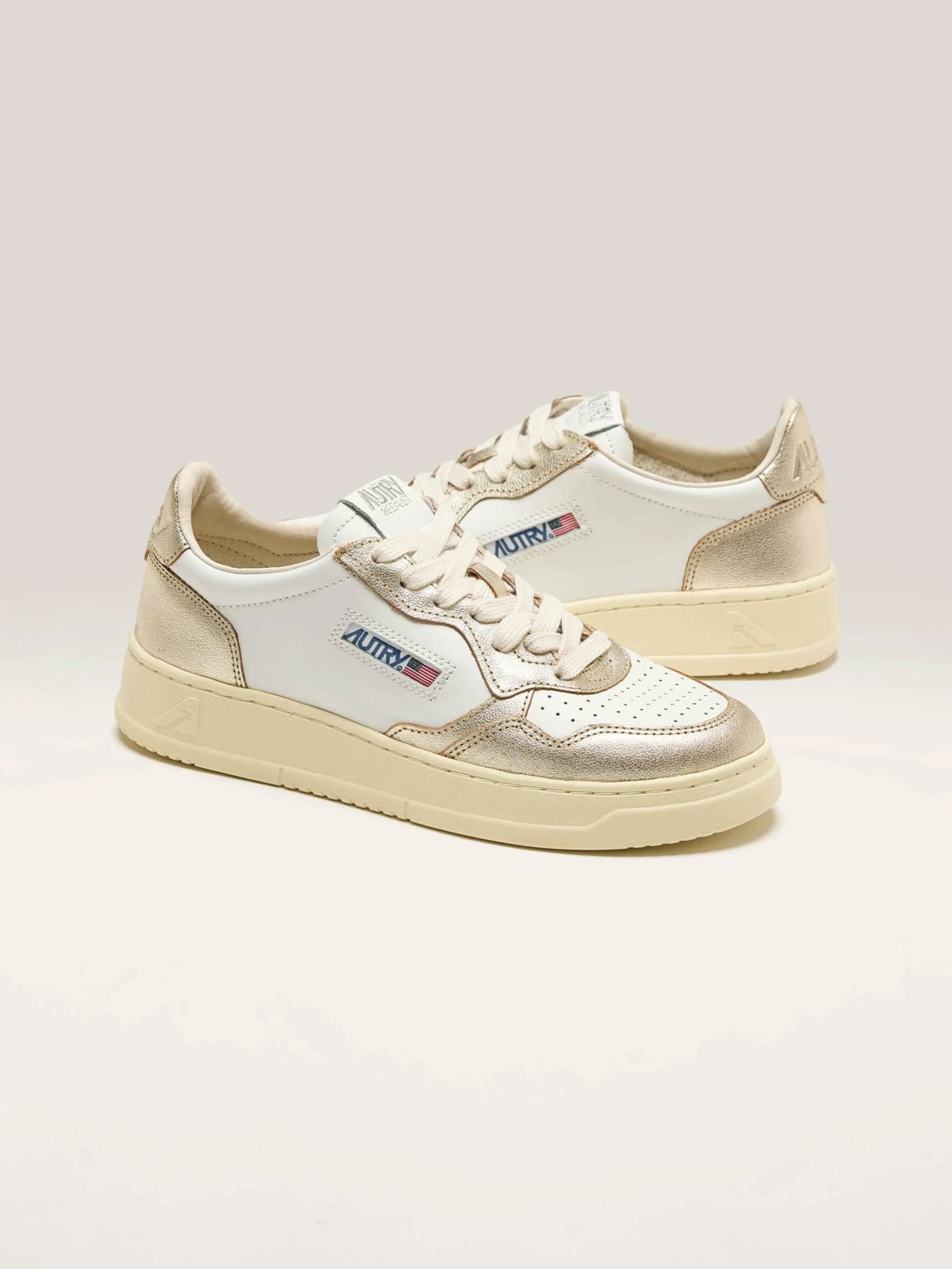 Les sneakers Autry Medalist Low Bicolor présentent une tige en cuir souple blanc et platine métallisé avec un bout perforé.