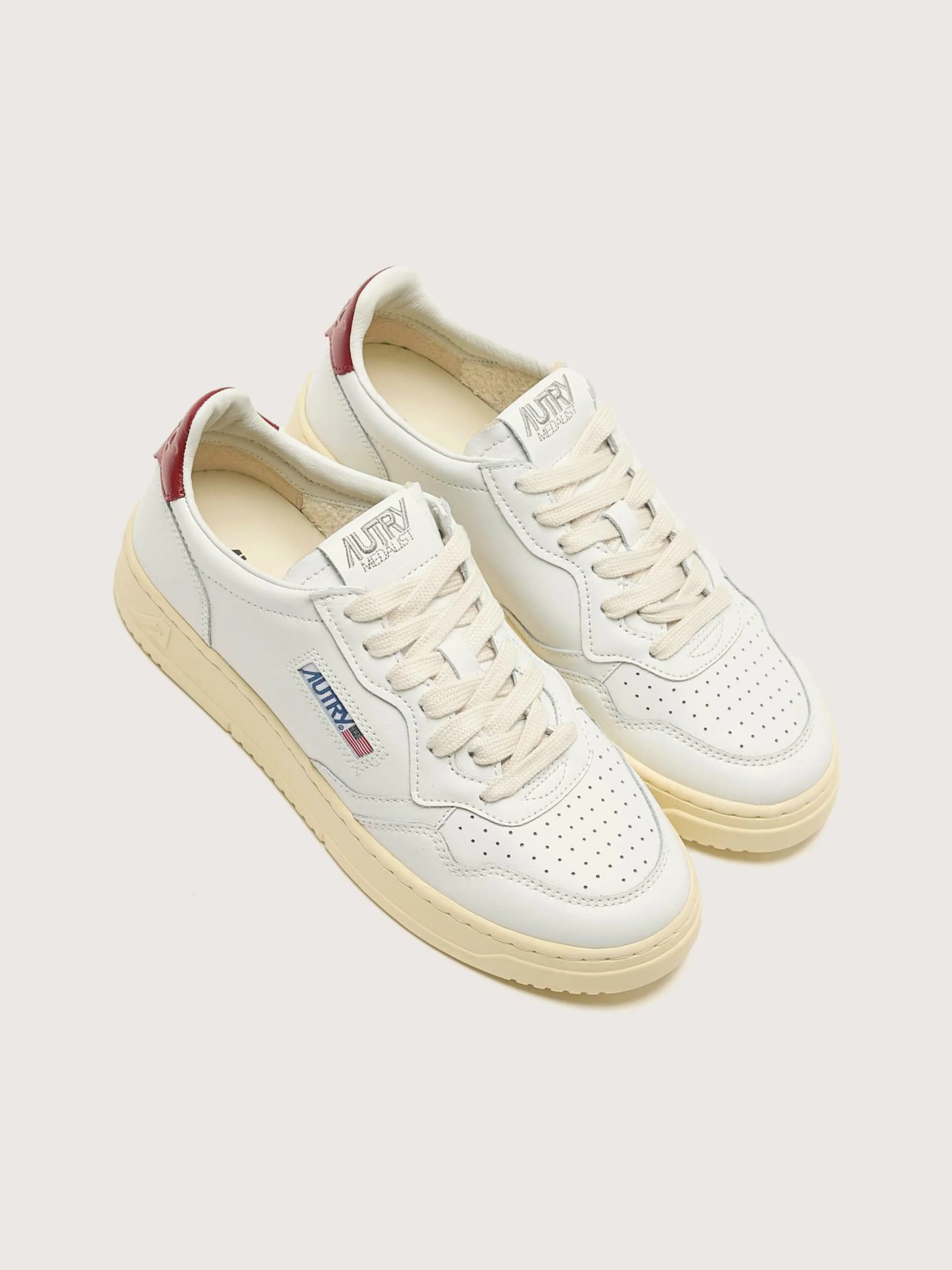 Les sneakers Autry Medalist Low présentent une tige en cuir blanc souple et une languette arrière du talon en cuir bordeaux, créant un contraste dynamique. Conçues pour offrir agilité et soutien tout au long de la journée.