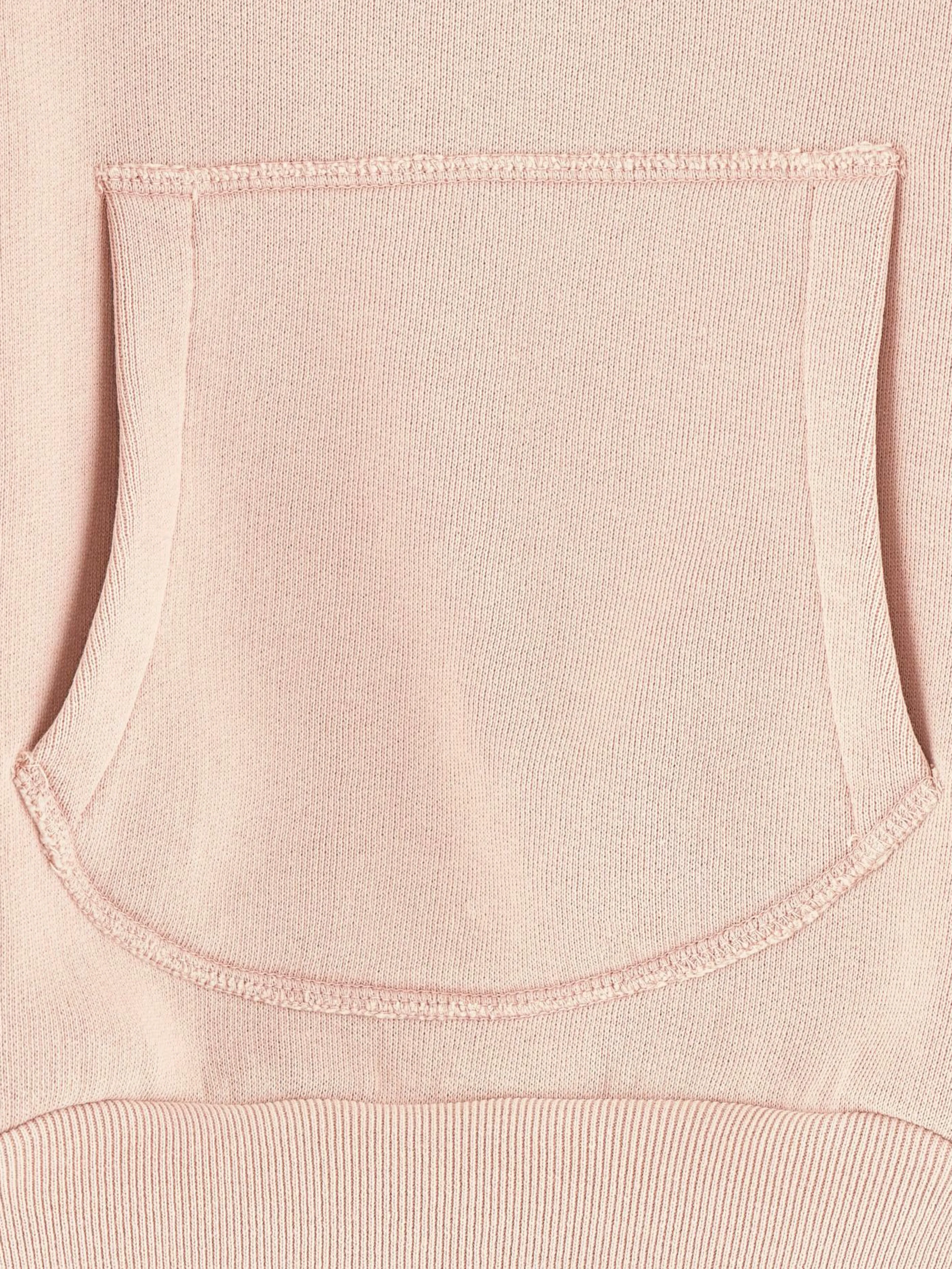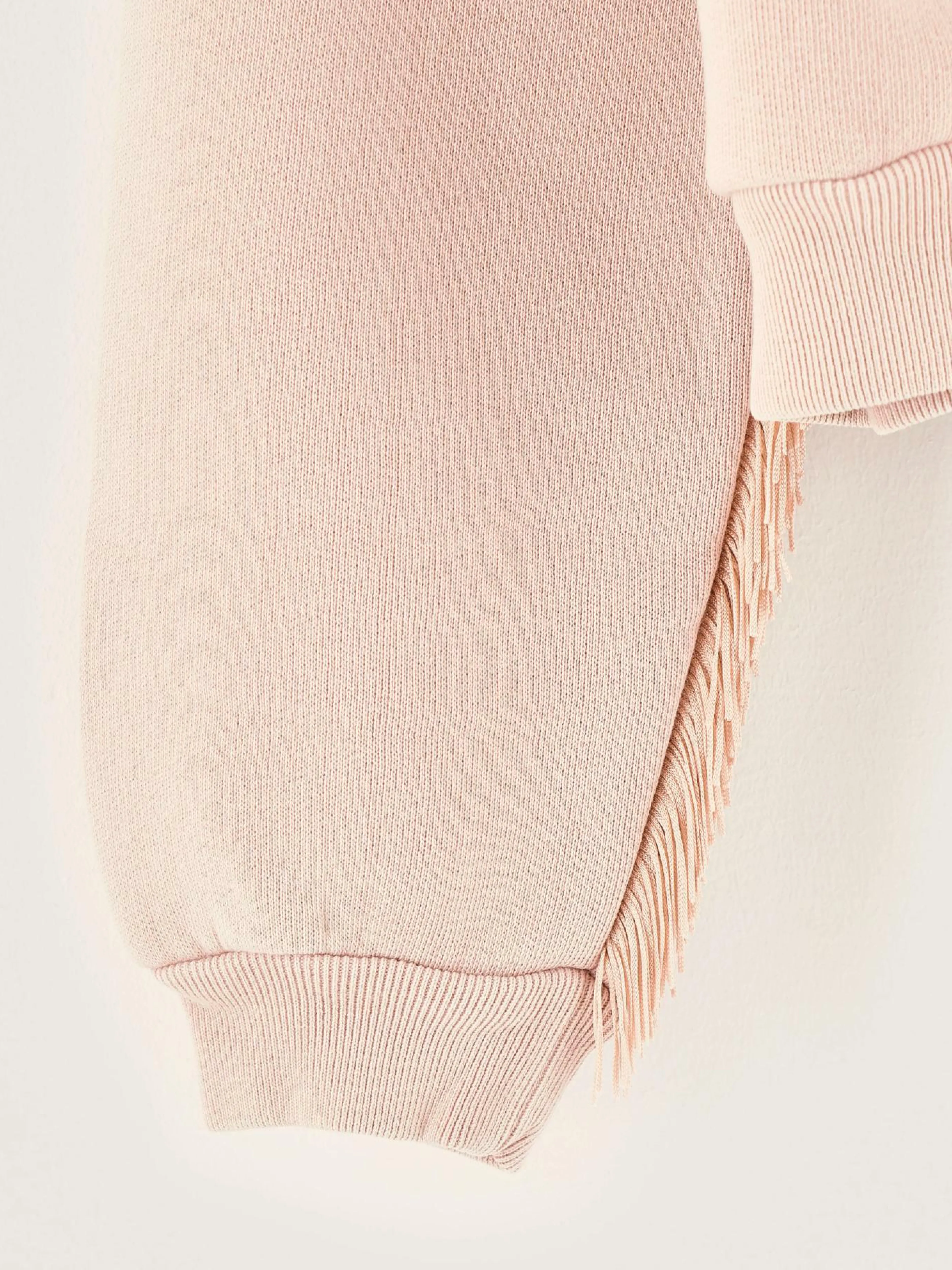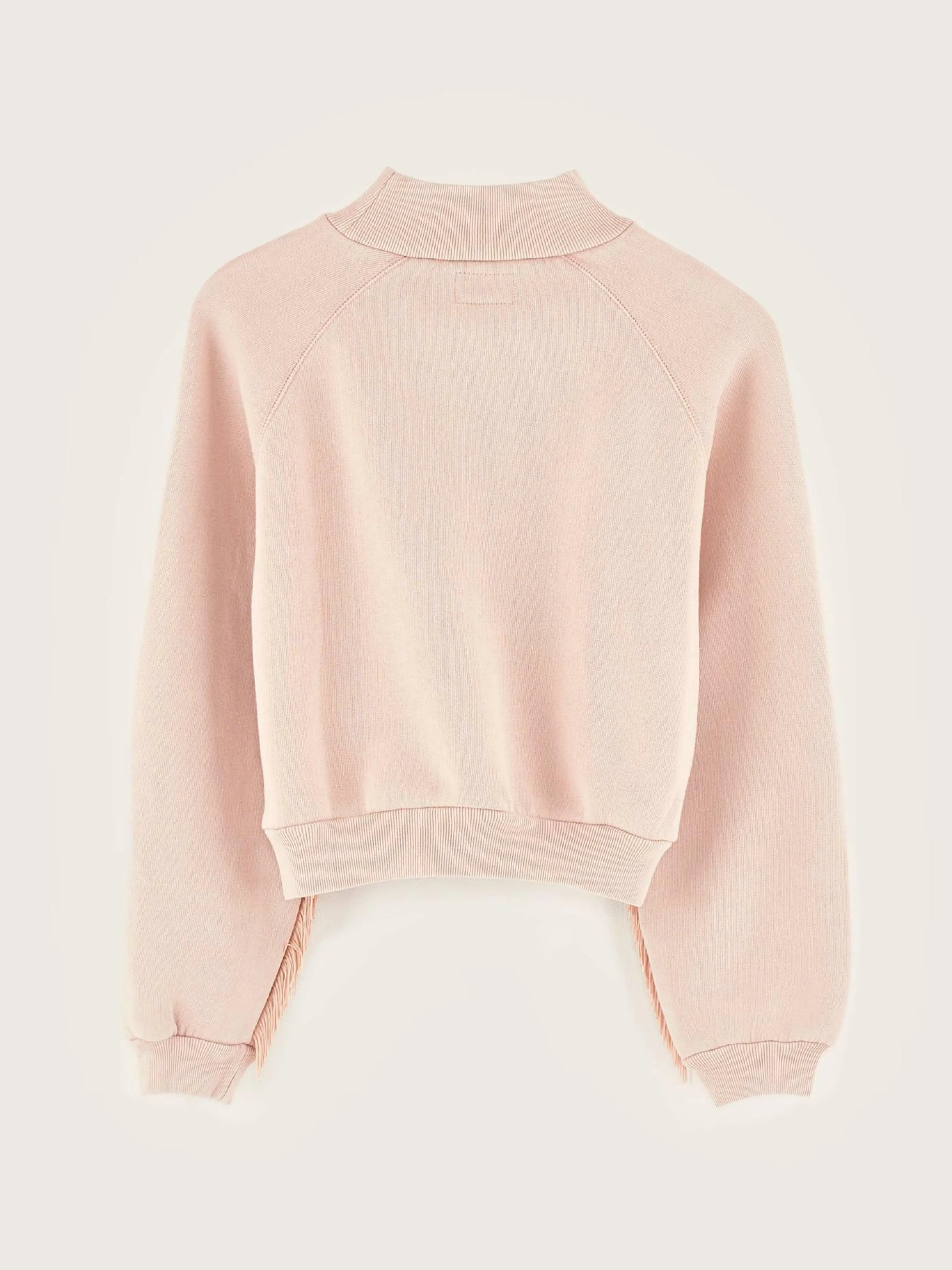 Sweatshirt en jersey rose poudré, coupe décontracté, col relevé et franges le long des manches.