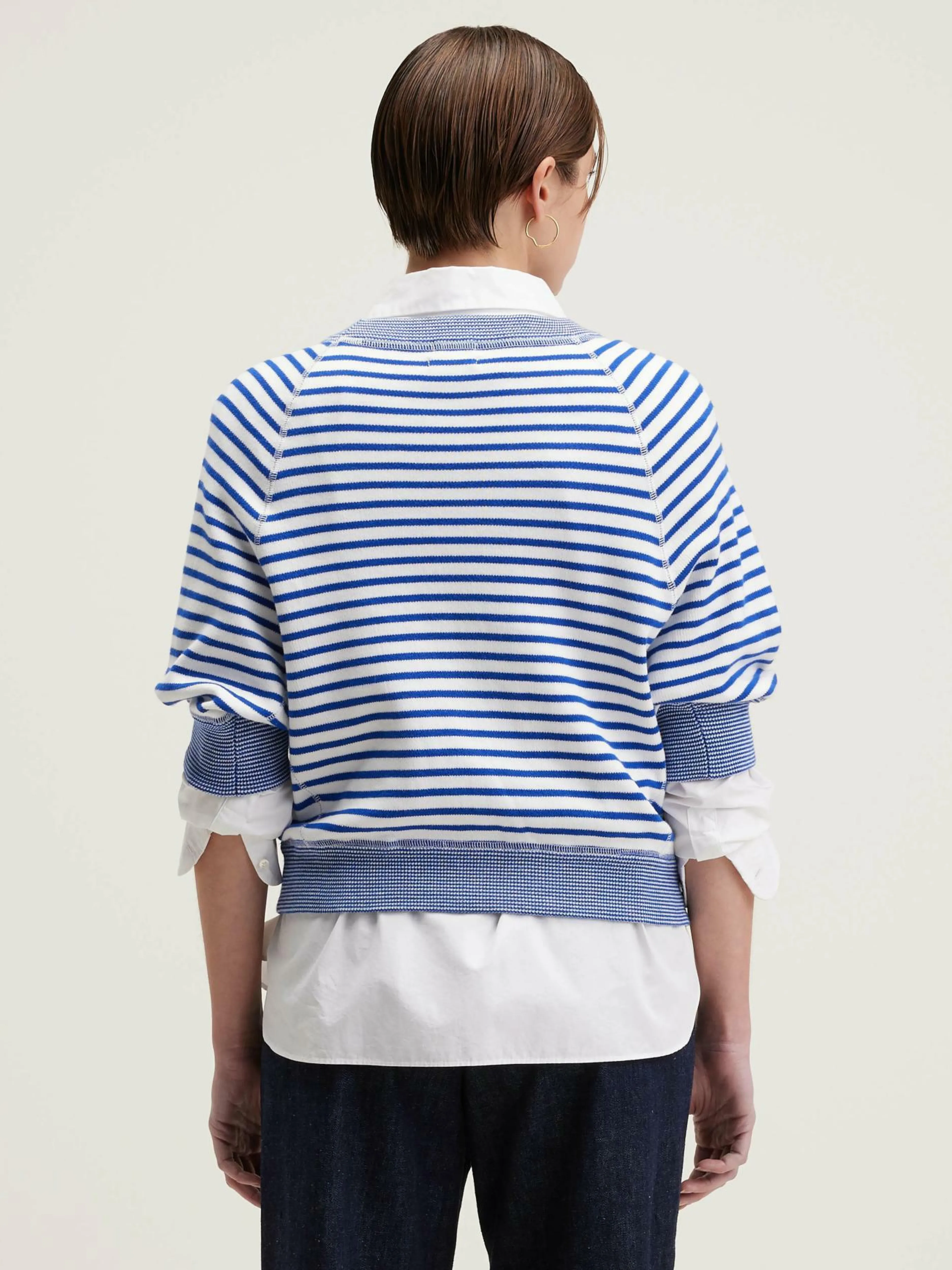 Pull col rond oversize avec manches 3/4 et bords côtelés en coton écru avec rayures bleues.