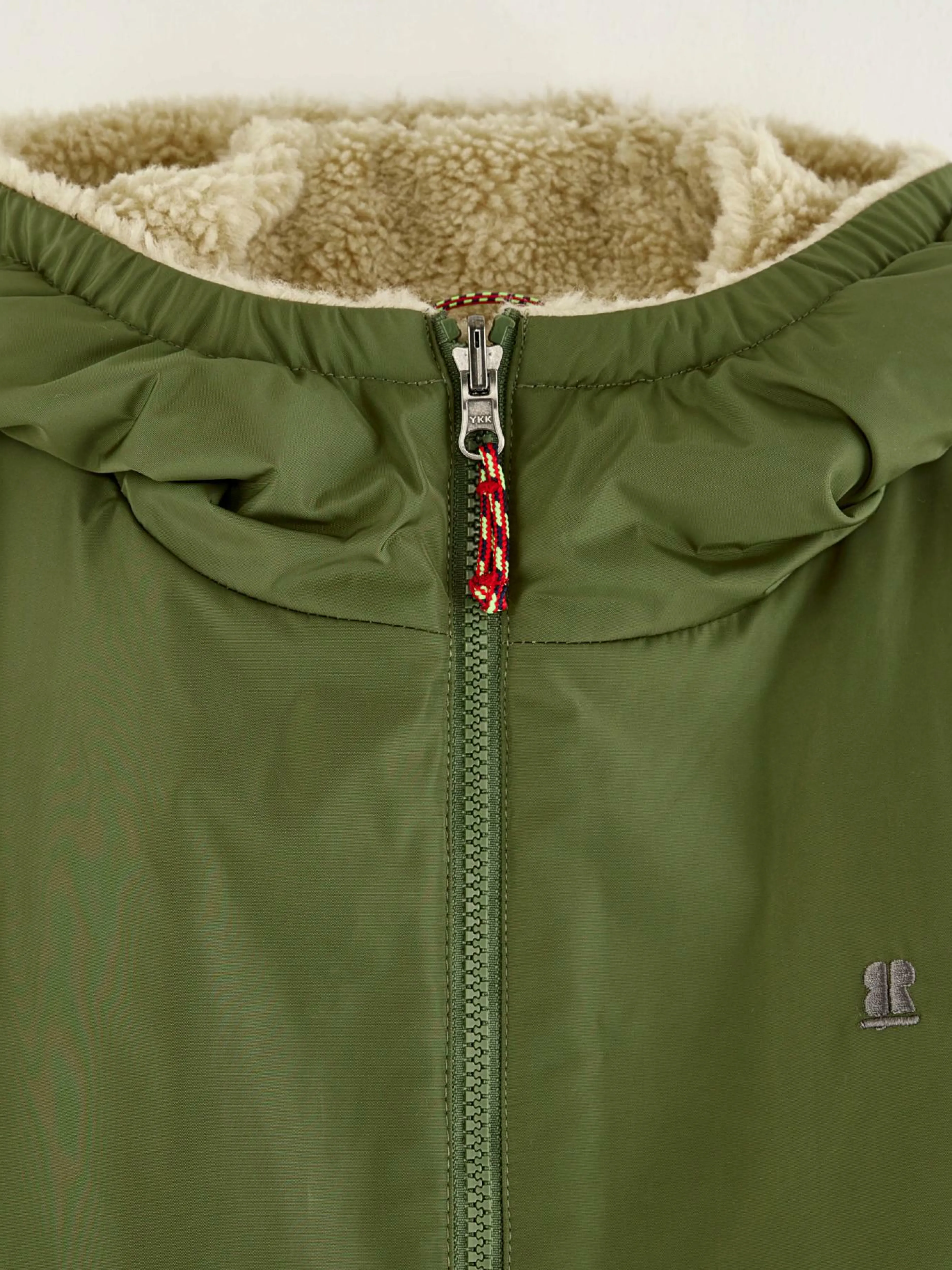 Veste réversible à capuche, coupe classique en tissu déperlant vert kaki et doublée de teddy.
