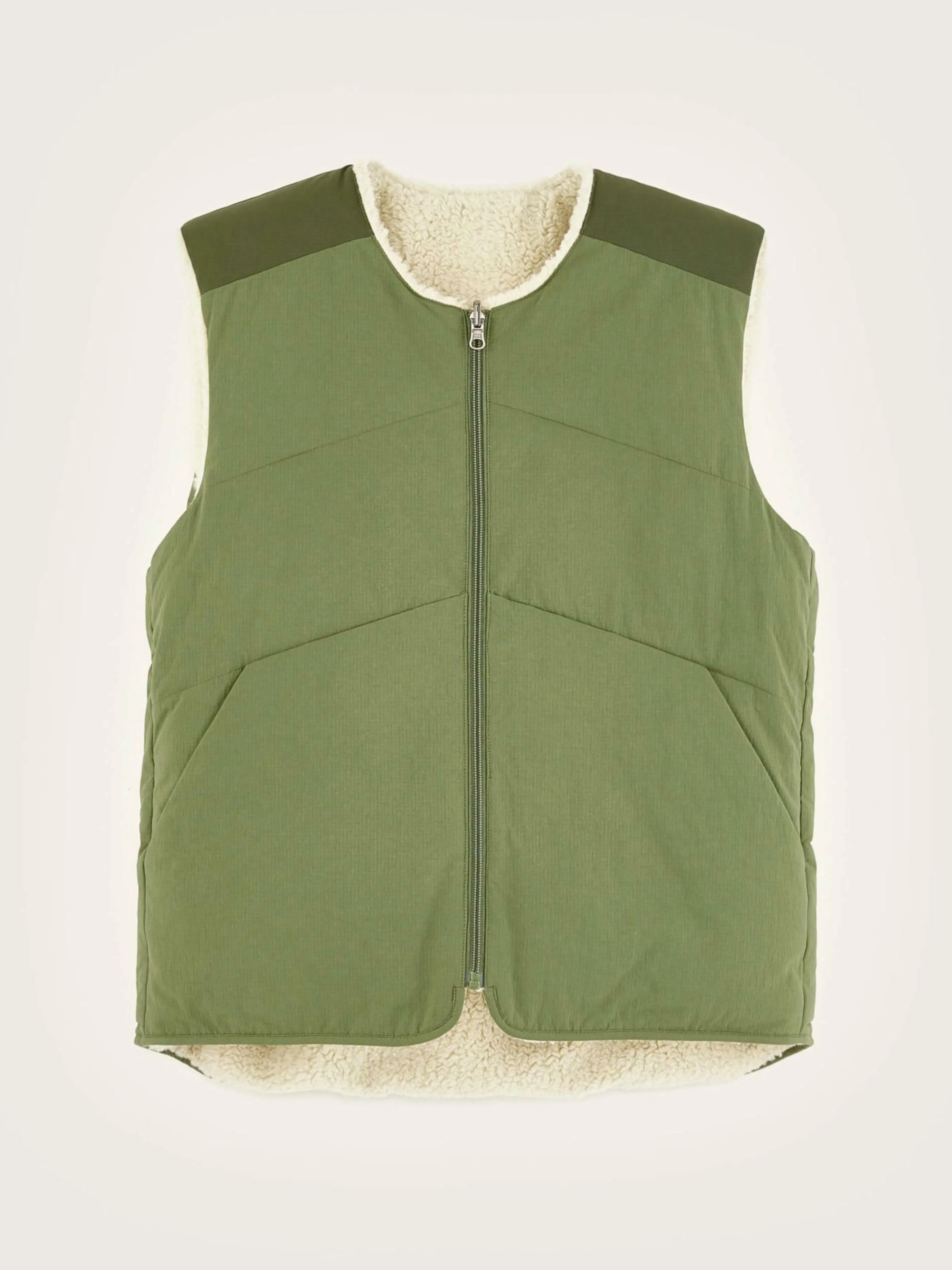 Bodywarmer zippé réversible en polyester couleur vert militaire et doublé en teddy écru.