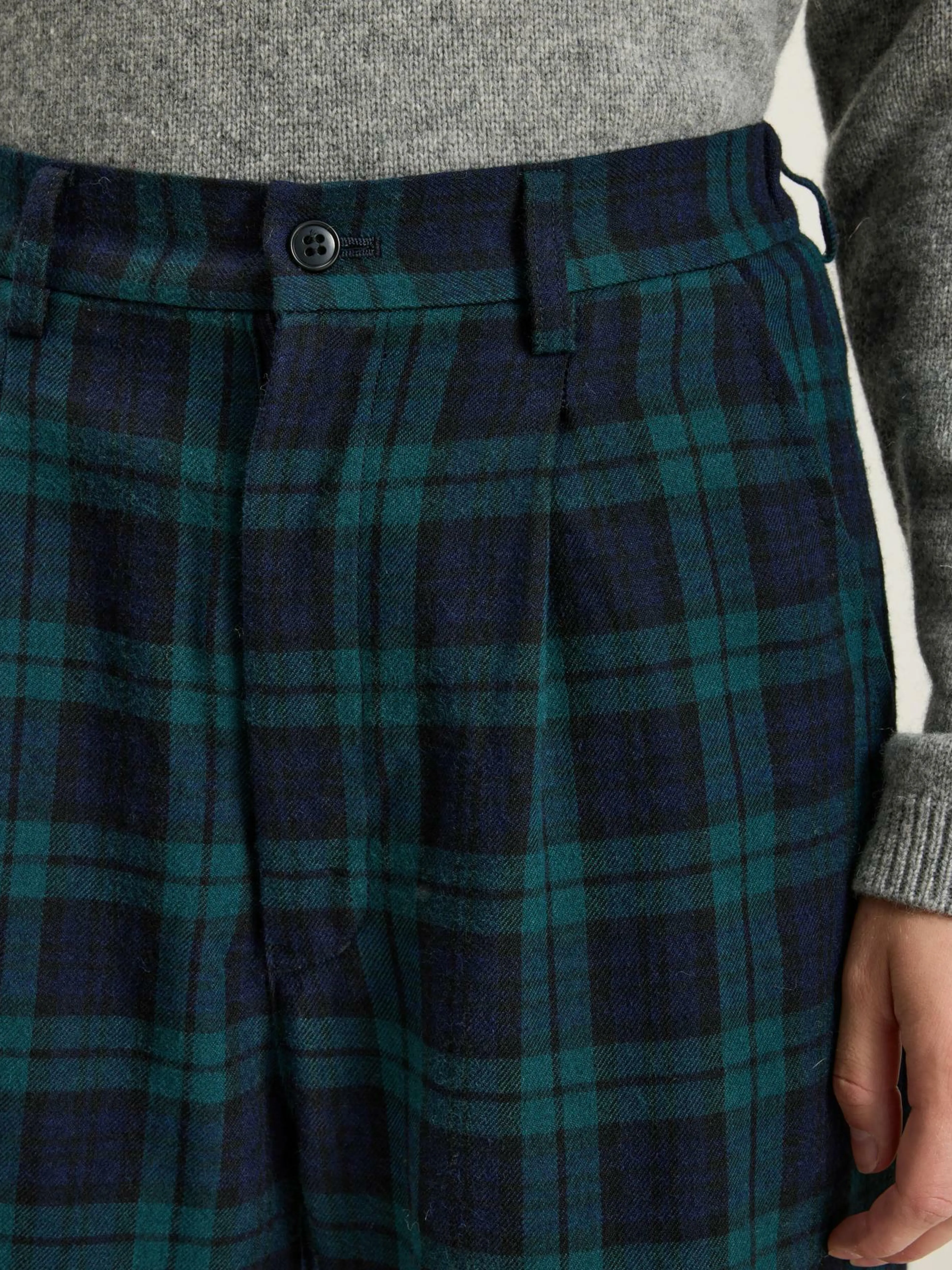 Le pantalon Sarahwear Saxophonist, fabriqué dans un mélange de laine et coton, présente une coupe masculine avec plis à la taille et une taille élastique à l’arrière.