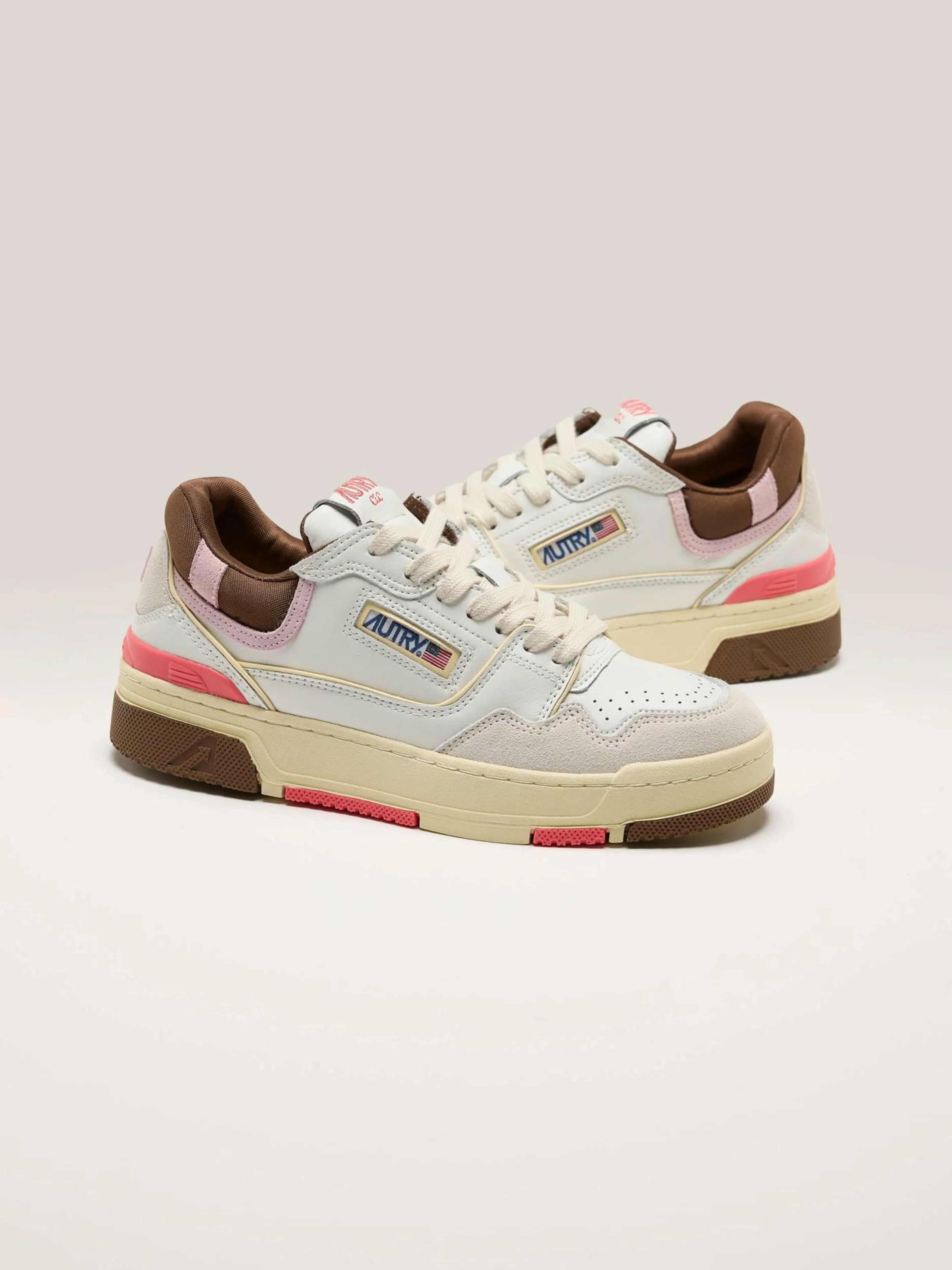 Les sneakers Autry CLC Low sont des sneakers basses inspirées du basket-ball, fabriquées en cuir blanc avec des détails dans deux tons de rose et de marron, avec une tige en cuir et suède, un col en maille rembourré et une semelle haute en caoutchouc.