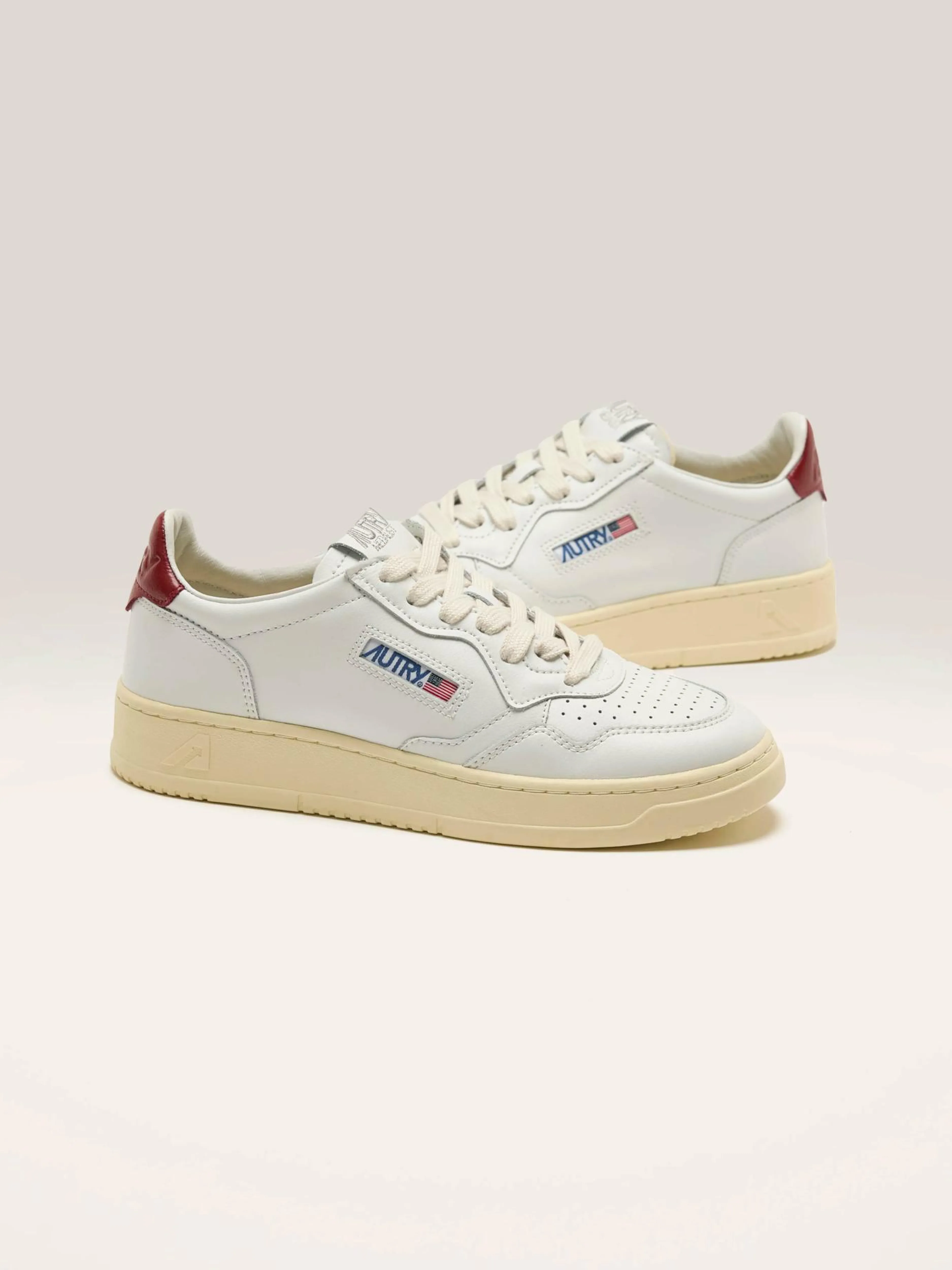 Les sneakers Autry Medalist Low présentent une tige en cuir blanc souple et une languette arrière du talon en cuir bordeaux, créant un contraste dynamique. Conçues pour offrir agilité et soutien tout au long de la journée.